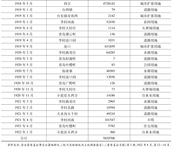 日本政府的态度及举措刺激了大批日本人赴青岛工作及生活,相关土地需求更加旺盛,青岛民政署的土地收购数量快速增加(参见表1)。从收购区域来看,在青岛市区内,1917年,青岛民政署陆续收购港口附近的三条町、薄云町、轻藻町、广野町共808平方米土地作为道路用地,收购叶樱町5865平方米的土地作为住宅用地。这几处土地面积不大,但因是连接大港与日侨街区的要道,在商业发展上极为重要。此外,为吸引日本工业投资,青岛民政署在台东镇以西购入2142平方米的土地作为工业指定用地,三井油坊、青岛骨粉制造所、日本金属工厂、青岛火柴工厂等日本大企业皆在此设厂。1918年后,青岛市郊李村、沧口、四方的土地也被大量收购。李村的购地大部分用作水源、农园和道路,沧口的购地名义上用于扩建街区,但实际大多转为开设纺织工厂,沧口此后也成为日本纺织厂的聚集区。1919和1920两年,青岛民政署又相继收购14067平方米土地用于道路建设以连接李村和沧口。1921年华盛顿会议召开后,日本在国际压力之下不得不面对归还青岛主权的问题,尤其是自德国继承的官有土地权益亦面临被迫交还中国的局面。在此背景下,青岛民政署仓促收购四方、沧口一带大量土地,并试图通过出售给日侨的方式,将官有土地变为私有土地。