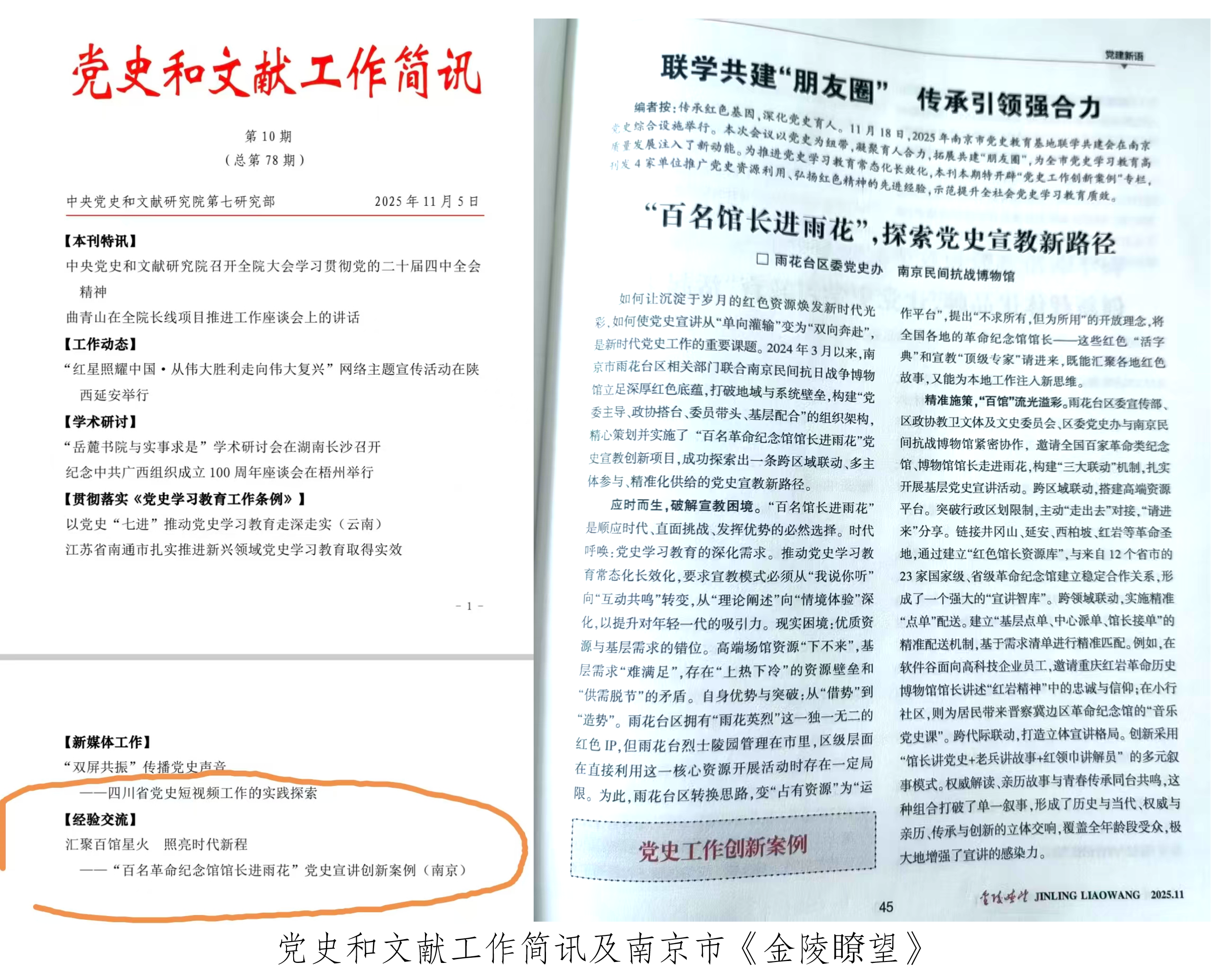 2025年我馆邀请南昌新四军部旧址陈列馆原馆长熊河水、福建省革命历史纪念馆原馆长杨卫东、中共代表团梅园新村纪念馆副馆长盛军、晋察冀边区革命纪念馆副馆长王芳、渡江胜利纪念馆原馆长吴小宝、中共一大纪念馆馆长薛峰、苏皖边区政府旧址纪念馆副书记潘新、晋察冀边区革命纪念馆讲解员卢智华、上海战役丹阳市总前委旧址纪念馆主任孙国武、中国人民抗日军政大学陈列馆副馆长李青、八路军太行纪念馆副馆长李国伟、台儿庄大战纪念馆宣教科讲解员王晴等12位同志来南京雨花台区各街道驻地及高校开展14场“红色讲堂”,计有1370名社区老党员、高校师生参与听讲,该活动已累计完成26场。这一宣传党史新案例被中央党史和文献研究院工作简讯及南京市《金陵瞭望》采用,成为我市宣传党史新品牌。
