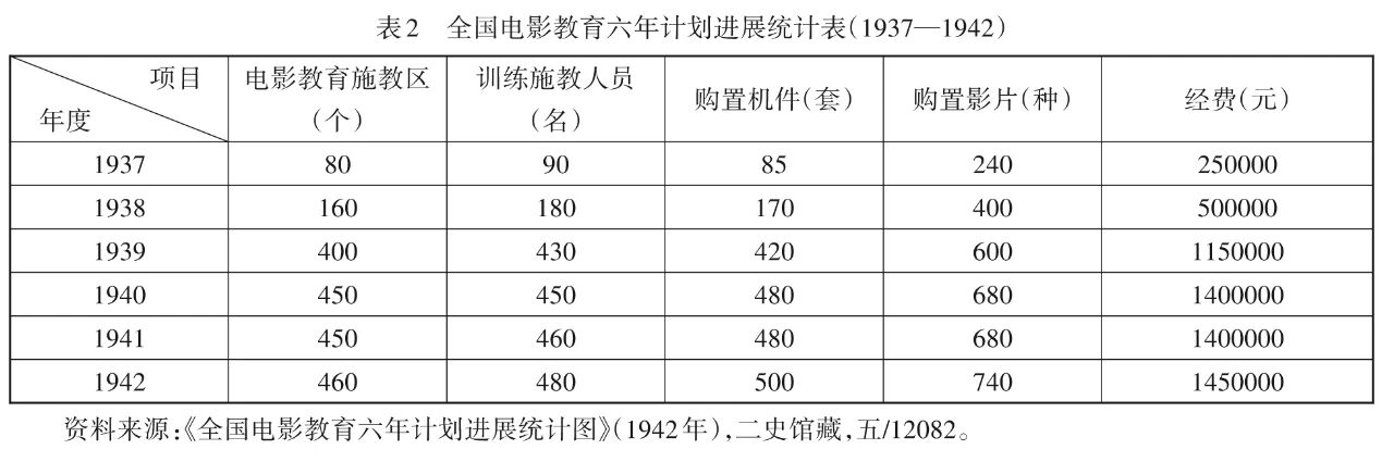 与此同时,国民政府教育部在1937年出台电影教育计划,主要内容包括两部分:一是在行政方面,增设新区、调整及充实委员会、训练人才、督促各省市电影行政及改成、实验电影教学;二是在技术方面,购置机件(映放、扩音、发电、幻灯)、摄制影片与幻灯片,并开展电影机双用镜头与手摇镜头发电机研究。国民政府将电化教育的重心转移至电影方面,实是因为电影在战时有着极强的感染力与宣传力,对于广大民众国民精神的凝聚有着无可替代的作用。实际上早在1936年,国民政府就未雨绸缪,成立了电影教育委员会,该委员会的主要职责包括国内外教育电影的选购与交换、教育影片的摄制以及实施教育电影的相关问题研究,其在1937年的制片目标定为“发扬民族意识,提倡新生活运动,灌输国防知识,了解国民经济建设,授予生活常识,协助学校教育”。在1936年,教育部还规划了全国电化教育事业并拟定《电影教育六年计划草案》,计划在当年就成立80—100个巡回放映区,并不断扩大电化教育的影响范围。到1942年,全国已有460个电影教育施教区、480名施教人员(见表2)。