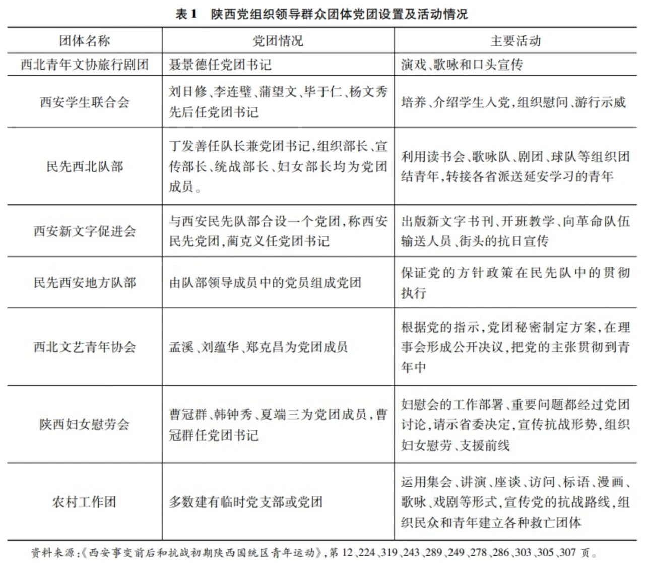 1937年7月15日,中共中央要求各级党组织积极建立救亡团体,同时指示共产党员应成为各地救亡组织的发起者。以青年学生群体为例,共产党通过党团主持学生团体的领导机关,自上而下推动组织扩展。早在1937年年初,中共陕西省委即设立西安学生工作委员会,管理西安各校党支部及西安学生联合会、西北文艺青年协会等团体中的党团。该委员会的主要任务是贯彻中共陕西省委的决定、指令和工作安排;向各青年团体传达共产党的政策精神,保证共产党对西安学生运动的领导;指导群众组织开展救亡运动。全面抗战初期,在学生工作委员会的领导下,党团领导下的群众组织数量迅速增长,活动日益增多(参见表1)。