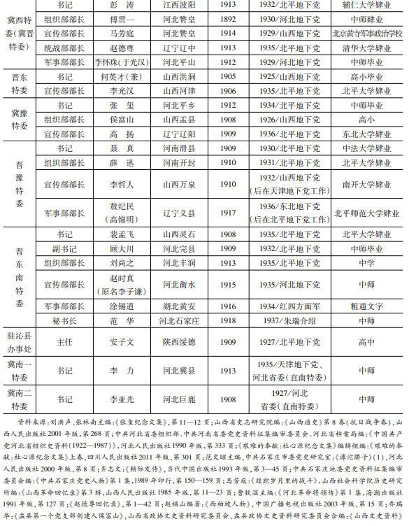 同时,除两位八路军派来的苏区干部外,这批特委干部都可算作白区干部,其核心是一批平津地下党干部(至少有13位)。他们均与刘少奇、彭真、李雪峰等人在北京共过事,经北方局安排或介绍来到晋冀豫。他们是晋冀豫根据地干部队伍的基盘,相互之间牵绊不深却又有渊源。这使得他们既能够团结在北方局、冀豫晋省委周围,又不至于一上来即形成严重的本位或山头,对后来根据地的政治整合与思想统合意义重大。