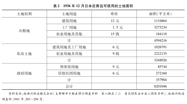 据满铁调查部统计,在全面侵华战争爆发前,日本在青岛的土地权益构成包括出租地、私有土地和政府用地三部分,日方可使用土地面积超过820万平方米,除条约规定的日本领事馆和日本居留民团所用的政府用地外,日侨在青岛租借土地和拥有的私有土地面积超过784万平方米(参见表2)。显然,青岛归还后,日本人在青岛居住、开展各类活动的基础,并没有发生实质性的改变。